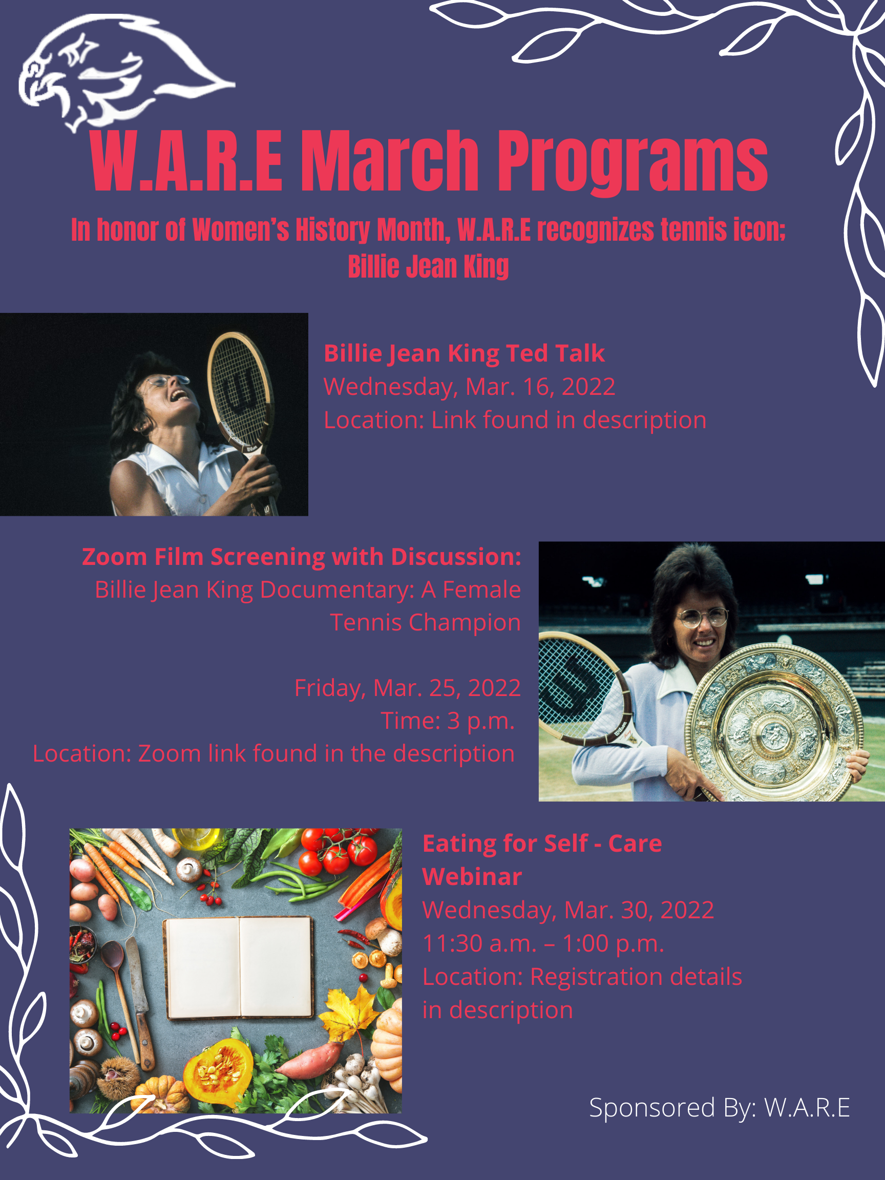 Description: Time to grab your favorite snack and some popcorn as W.A.R.E presents the screening of Billie Jean King Documentary: A Female Tennis Champion in celebration of Women’s History Month. In this film, we will learn about her fight for glory and equality in sports on behalf of women and the LGBT community. A brief Q&A discussion will follow, to further engage and speak to the vital role women played in history fighting social justice.