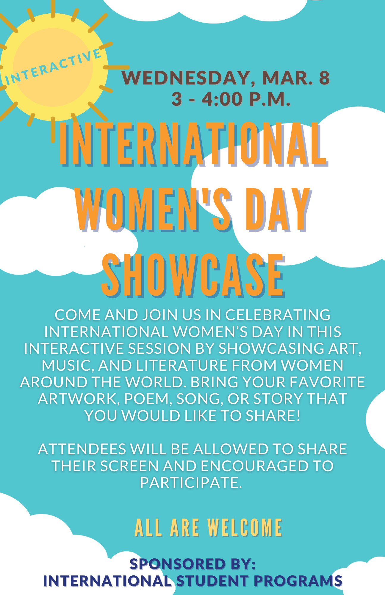 Come and join us in celebrating international women’s day in this interactive session by showcasing art, music, and literature from women around the world. Bring your favorite artwork, poem, song, or story that you would like to share! Attendees will be allowed to share their screen and encouraged to participate.