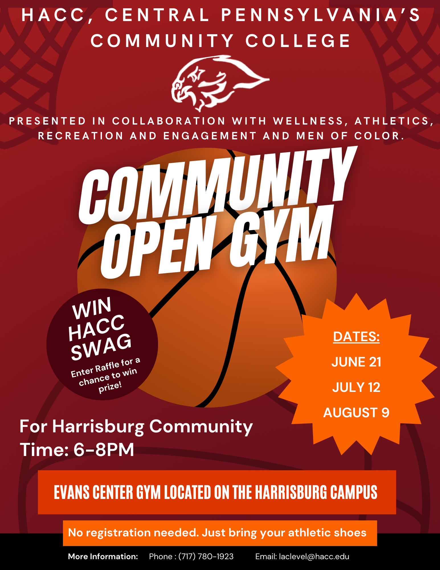 Too hot to play basketball at the park? Escape the heat and come join in Community Open Gym at HACC in the Evans Center Gym. W.A.R.E will be hosting three Community Open Gym dates this summer on Wednesday June 21, July 12, and August 9, 2023 from 6-8 p.m. No registration necessary, just bring your athletic shoes. Those who attend the open gym sessions can enter a raffle for a chance to win some HACC Swag!