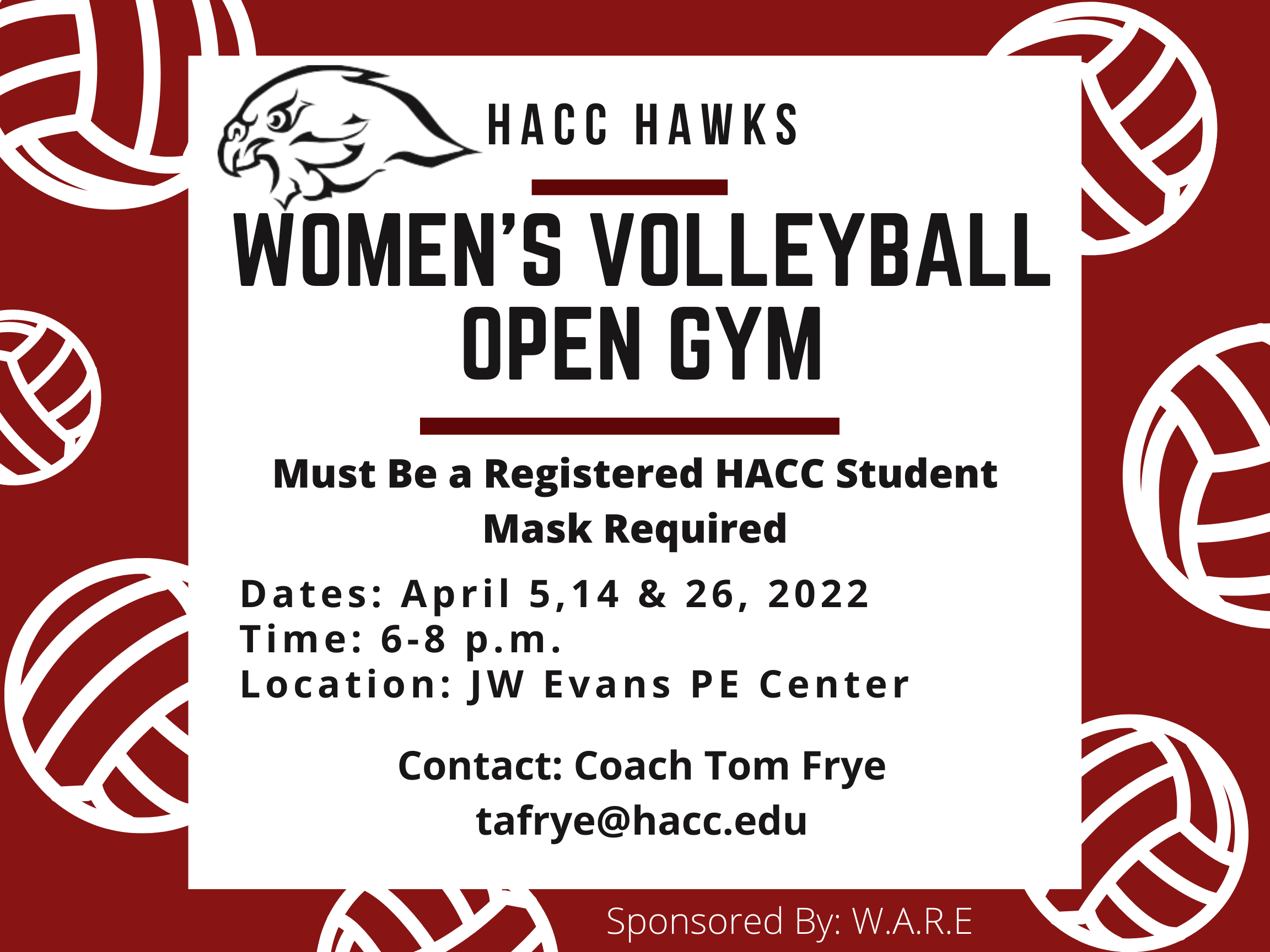 Interested in playing volleyball for HACC? We are looking for you! HACC Hawks Women’s Volleyball will be holding Open Gyms in April from 6-8 p.m. in the Evans Center Gym located on the Harrisburg Campus. For more information, please contact Head Coach Tom Frye at tafrye@hacc.edu.