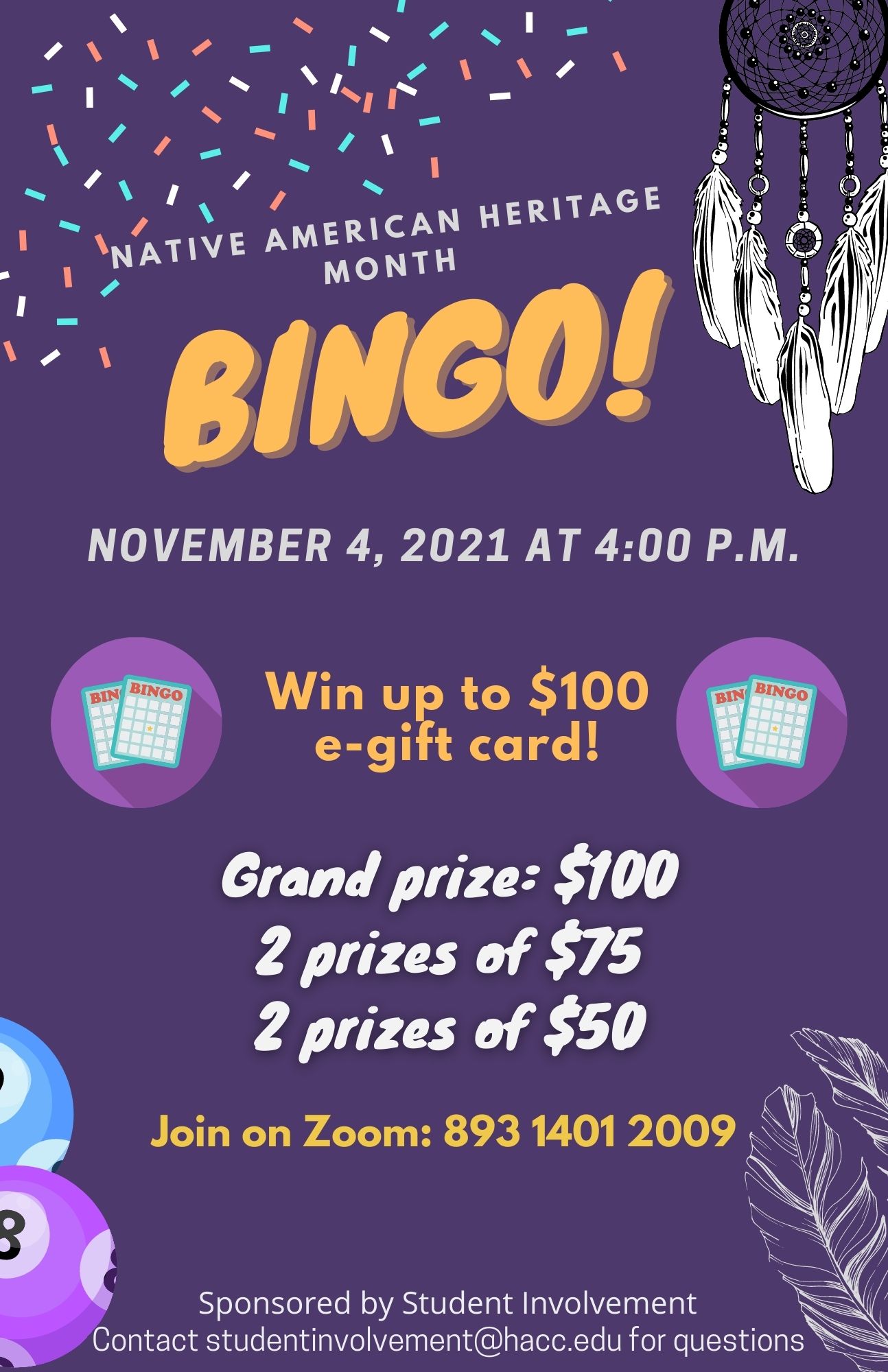 Join Student Involvement on Thursday, Nov. 4, from 4-5 p.m. for Native American Heritage Month Bingo Awareness.This is a fun and educational game. There will be five rounds for a chance to win up to a $100 E-gift card.