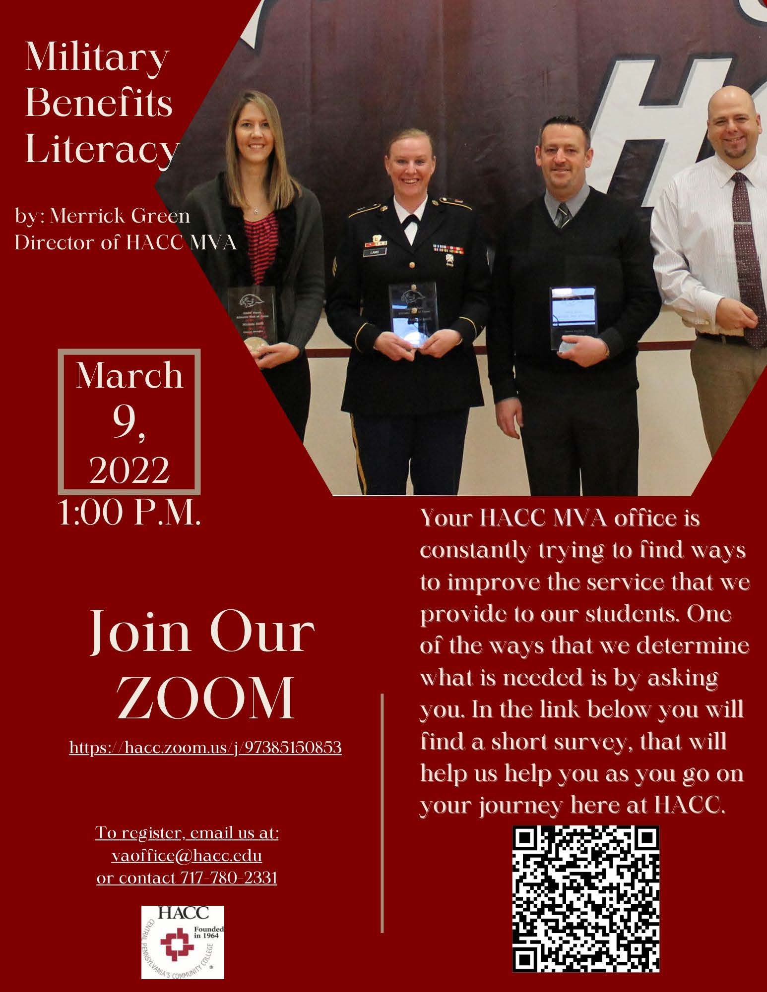 HACC Student Veterans of America is the premier organization leading service, research, programs, and advocacy for veterans in higher education. The mission of HACC Student Veterans of America is to act as a catalyst for student veteran success by providing resources, network support and advocacy through, and beyond higher education. Additionally, the HACC SVA group provides resources to Veterans Benefits and Networking opportunities. March 9, 2022 at 1:00pm via Zoom