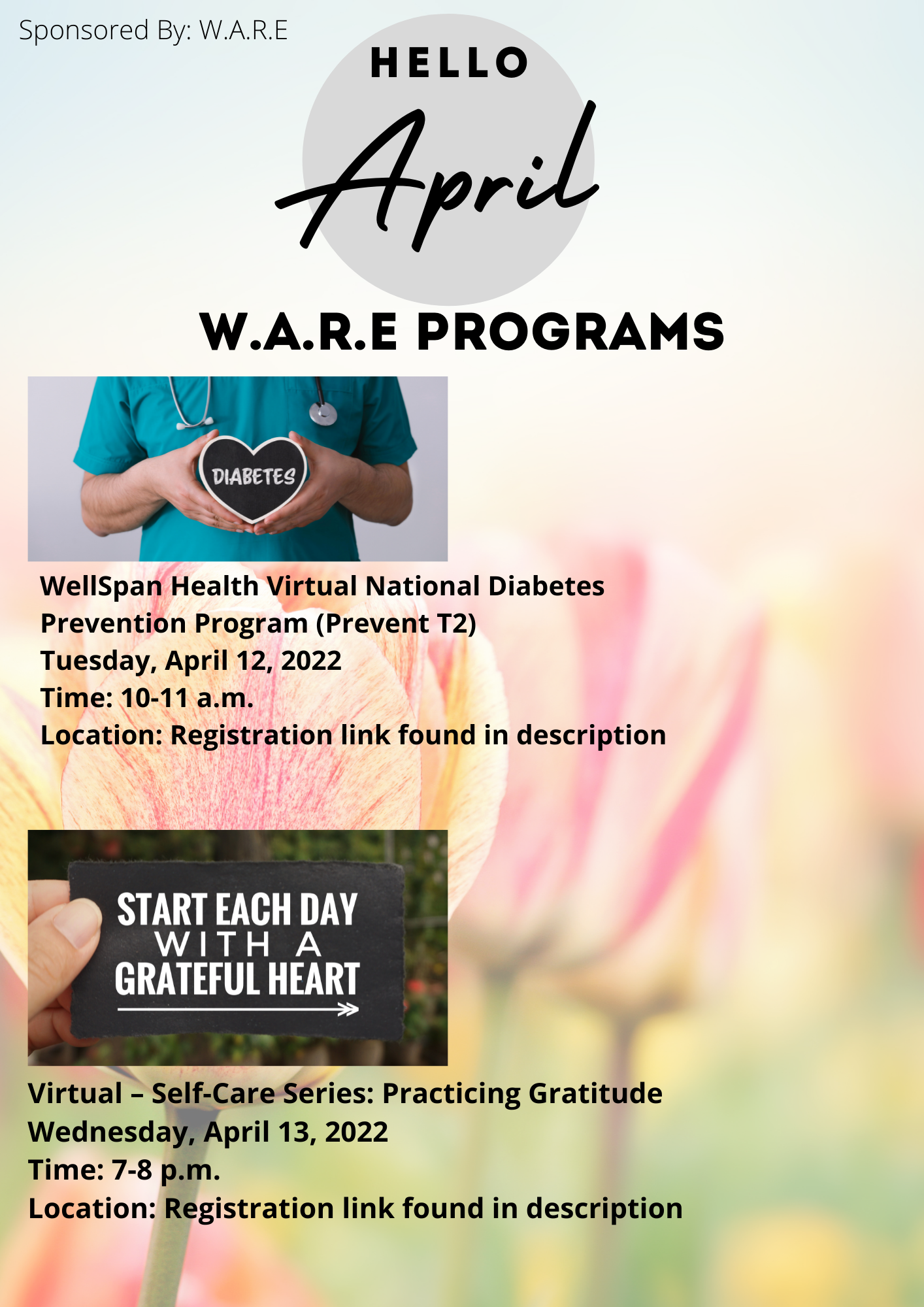 Description: Join is the WellSpan class “PreventT2” targeting diabetes prevention on April 12, 2022. This class is geared to assist those with pre-diabetes change their daily routines and cut the risks of developing Type 2 diabetes. This is an introductory session to provide participants information on the overall goals and objectives of the program. The first official class will begin on April 19, 2022.