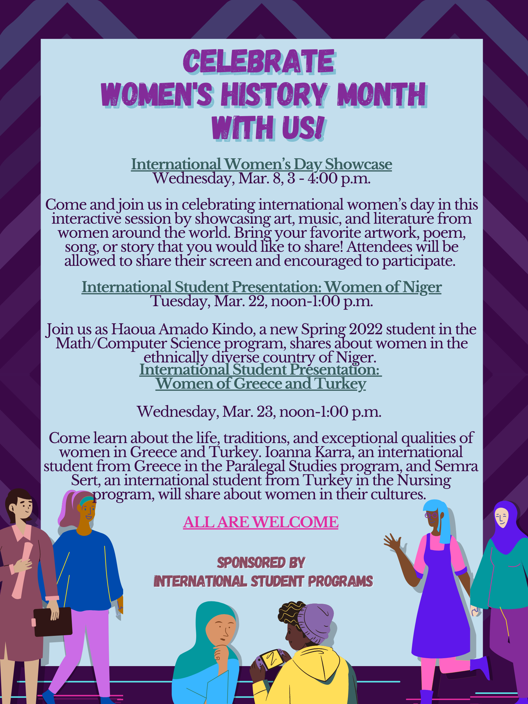 Come learn about the life, traditions, and exceptional qualities of women in Greece and Turkey. Ioanna Karra, an international student from Greece in the Paralegal Studies program, and Semra Sert, an international student from Turkey in the Nursing program, will share about women in their cultures.